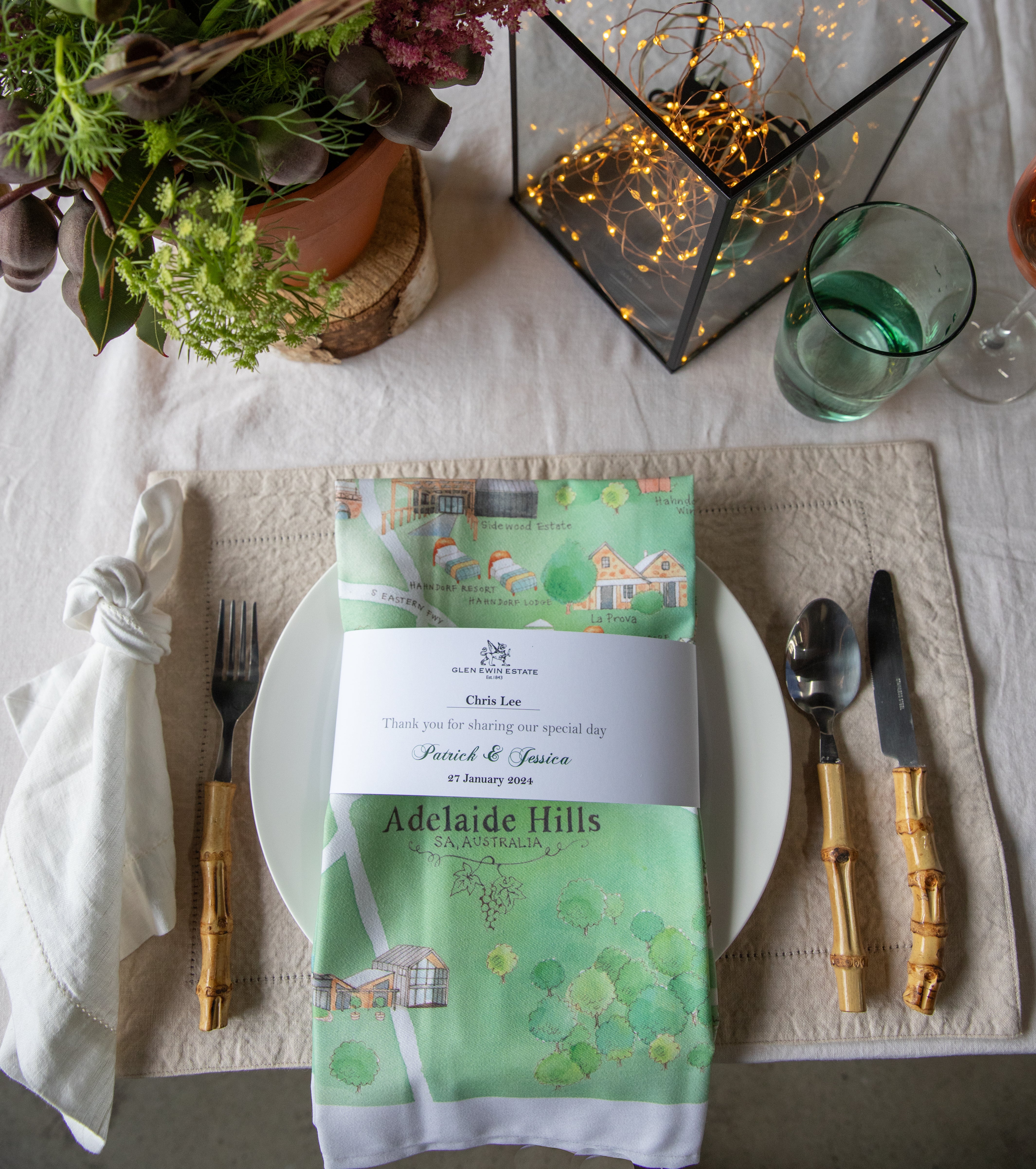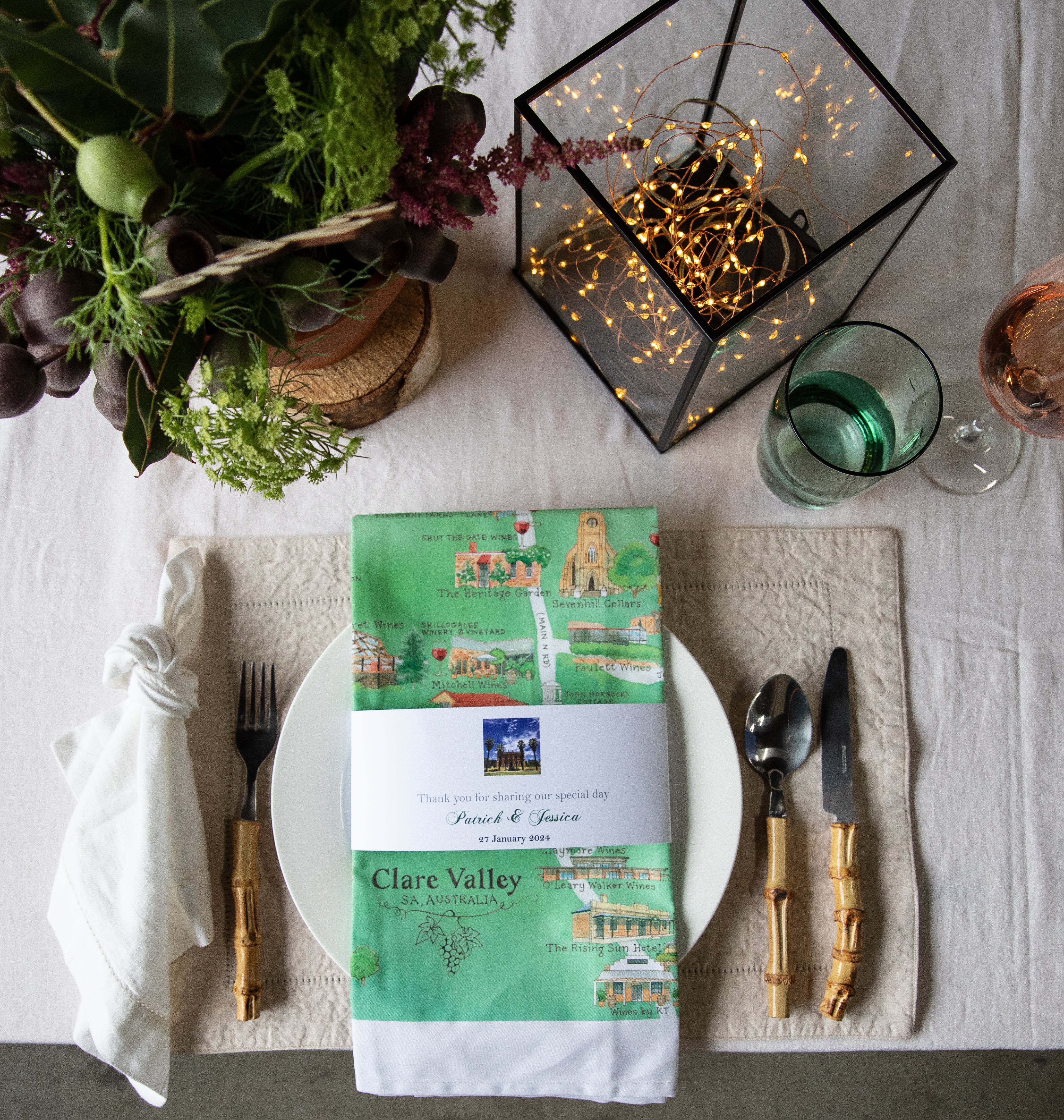 Our watercolour-illustrated map tea towels can be beautifully customised with a full-colour cardboard belly band, making them the perfect dual-purpose gift: a thank you gift with personalised message or wedding/event bomboniere that also doubles as a guest place card for your event.